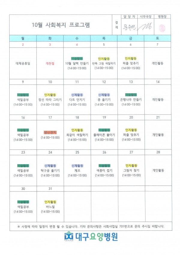 2023년 10월 사회복지 프로그램 안내입니다. 페이지 정보 작성자 관리자 작성일23-10-05 17:47 조회3,005회 댓글0건 관련링크 이전글 다음글 목록 본문 안녕하세요, 대구요양병원입니다^^추석 연휴 건강하고 즐겁게 잘 보내셨나요?10월 사회복지 프로그램 일정표를 안내해드립니다.가을과 관련된 주제를 이용하여 어르신들의 인지기능에 도움이 되는프로그램을 준비해 활동해보려고 합니다.일교차가 점점 심해지고 기온이 낮아지고 있으니항상 건강 조심하시길 바랍니다^^감사합니다^^ 이전글 다음글 목록