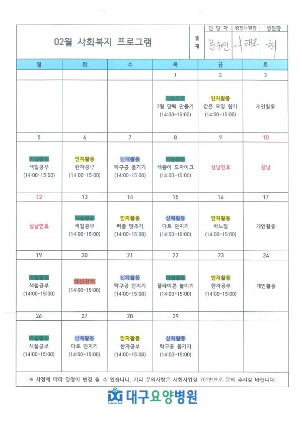 2024년 2월 사회복지 프로그램 안내입니다. 페이지 정보 작성자 관리자 작성일24-02-03 09:41 조회2,700회 댓글0건 관련링크 이전글 다음글 목록 본문 안녕하세요, 대구요양병원입니다^^2월 프로그램 일정표 안내해드립니다~어르신들께서 즐겁게 수행하실 수 있고 작은 즐거움을 드릴 수 있도록잘 구성하고 준비해보도록 하겠습니다^^최근 기온이 많이 낮지 않습니다만 따뜻한 옷차림을 유지하시고건강 유지 잘하시길 바랍니다. 다가오는 설 명절에도 행복하고 따뜻하게 보내시길 바랍니다^^ 이전글 다음글 목록