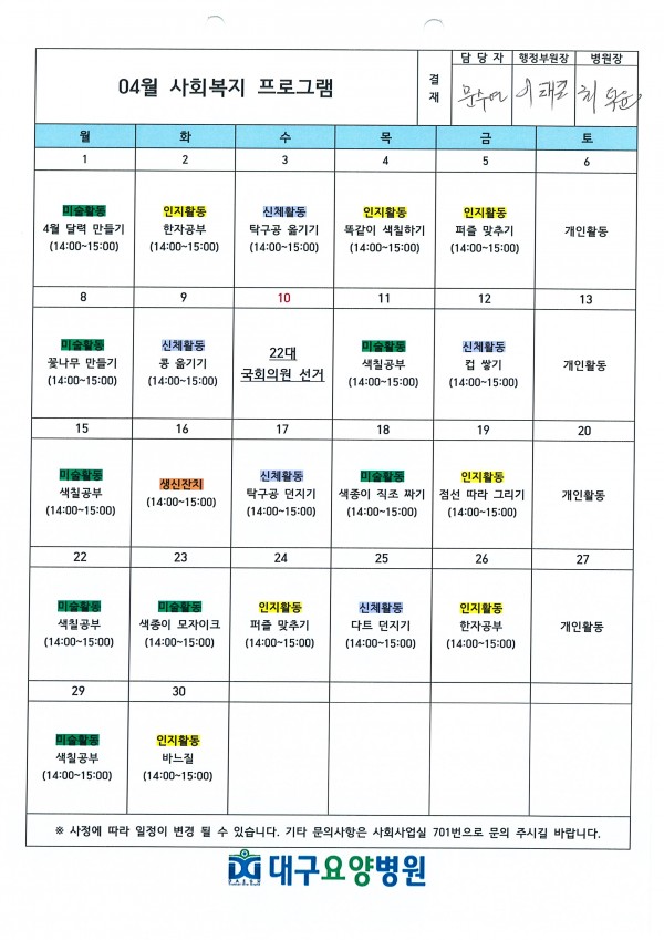 2024년 4월 사회복지 프로그램 안내입니다. 페이지 정보 작성자 관리자 작성일24-04-01 14:02 조회2,254회 댓글0건 관련링크 이전글 다음글 목록 본문 안녕하세요, 대구요양병원입니다^^4월 사회복지프로그램 안내드립니다~봄과 관련된 활동을 준비하여 어르신들과 함께 시간을 보낼 예정입니다.어르신들께서 즐겁게 활동하실 수 있도록 노력하겠습니다^^ 이전글 다음글 목록