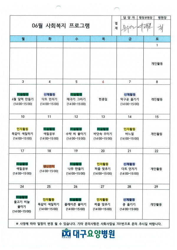 2024년 6월 사회복지 프로그램 안내입니다. 페이지 정보 작성자 관리자 작성일24-06-03 16:46 조회2,075회 댓글0건 관련링크 이전글 다음글 목록 본문 안녕하세요~ 대구요양병원입니다.6월 사회복지 프로그램 일정표 안내드립니다~여름 날씨와 관련된 활동을 준비하여 진행할 예정입니다.낮에는 덥지만 아직까지 저녁에는 쌀쌀한 날씨가 지속되고 있습니다.보호자분들께서도 항상 건강 조심하시길 바랍니다.감사합니다^^ 이전글 다음글 목록