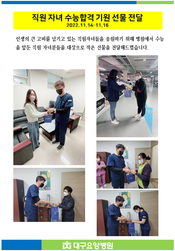 직원자녀 수능합격기원 선물 전달 페이지 정보 작성자 관리자 작성일22-11-17 11:02 조회3,320회 댓글0건 관련링크 이전글 다음글 목록 본문 19년동안 부모님들 고생많으셨습니다. 화이팅 이전글 다음글 목록