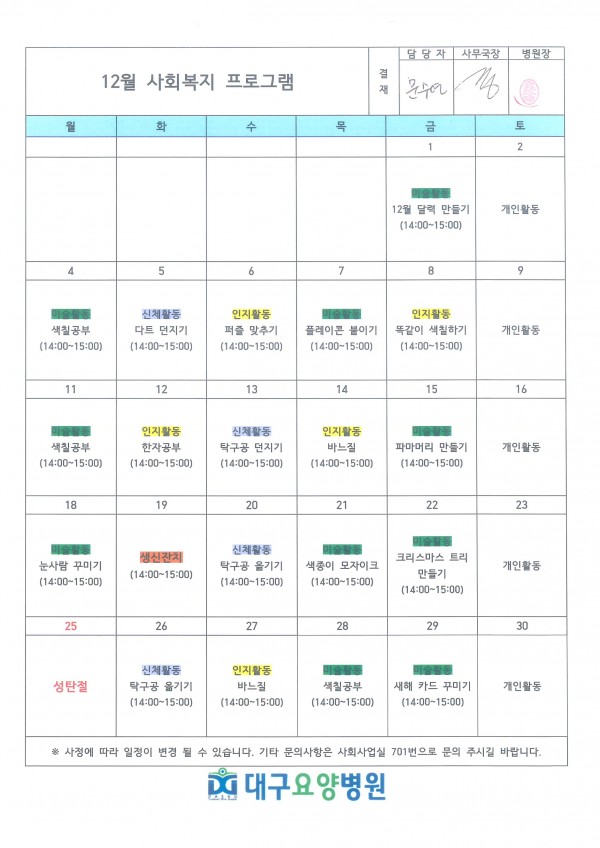 2023년 12월 사회복지 프로그램 안내입니다. 페이지 정보 작성자 관리자 작성일23-12-05 09:46 조회3,278회 댓글0건 관련링크 이전글 다음글 목록 본문 안녕하세요, 대구요양병원입니다^^2023년 12월 사회복지프로그램 일정표입니다.어르신들과 함께 겨울 그리고 성탄절과 관련된 활동을 할 예정입니다.즐거운 시간 보내실 수 있도록 노력하겠습니다.날씨가 점점 추워지고 있으니 건강에 유의하시길 바라며올 한 해 마지막까지 잘 보내시길 바랍니다.감사합니다^^ 이전글 다음글 목록