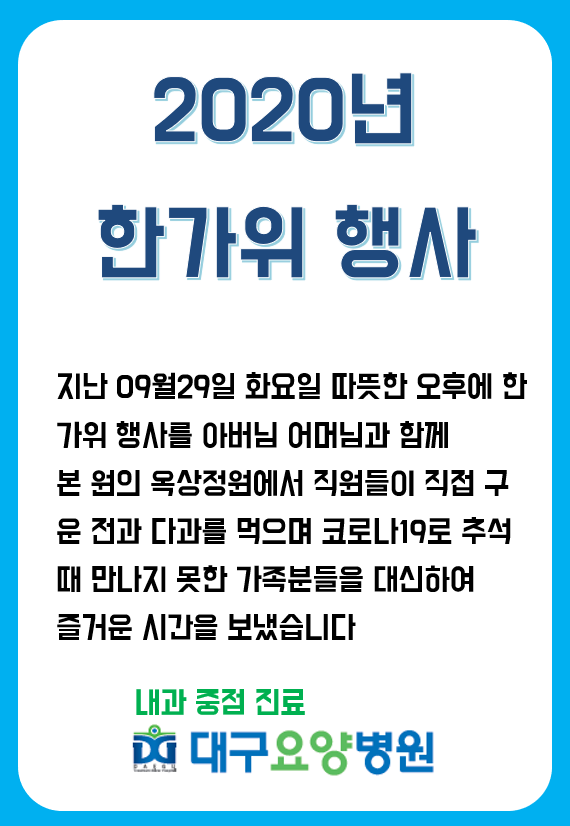 병원소식 •병원소개 •병원소식 병원소식 사회복지프로그램 자원봉사 고객소리함 협약병원 2020 한가위 행사 후기 페이지 정보 작성자 관리자 작성일20-10-16 17:37 조회4,900회 댓글0건 관련링크 이전글 다음글 목록 본문 아래 링크를 클릭하시면 대구요양병원 블로그에서 자세한 내용을 확인 할 수 있습니다.>> https://blog.naver.com/kkumedic 이전글 다음글 목록